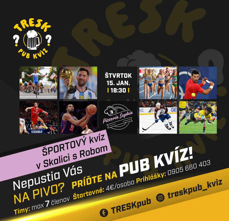 Pizzeria Sophia a TRESKpub pozývajú na športový kvíz, ktorý bude pozostávať z otázok na športové osobnosti, udalosti a momenty v 5 kolách. Víťazi získavajú vouchery na pizzu a 2x rundu pre celý tím!