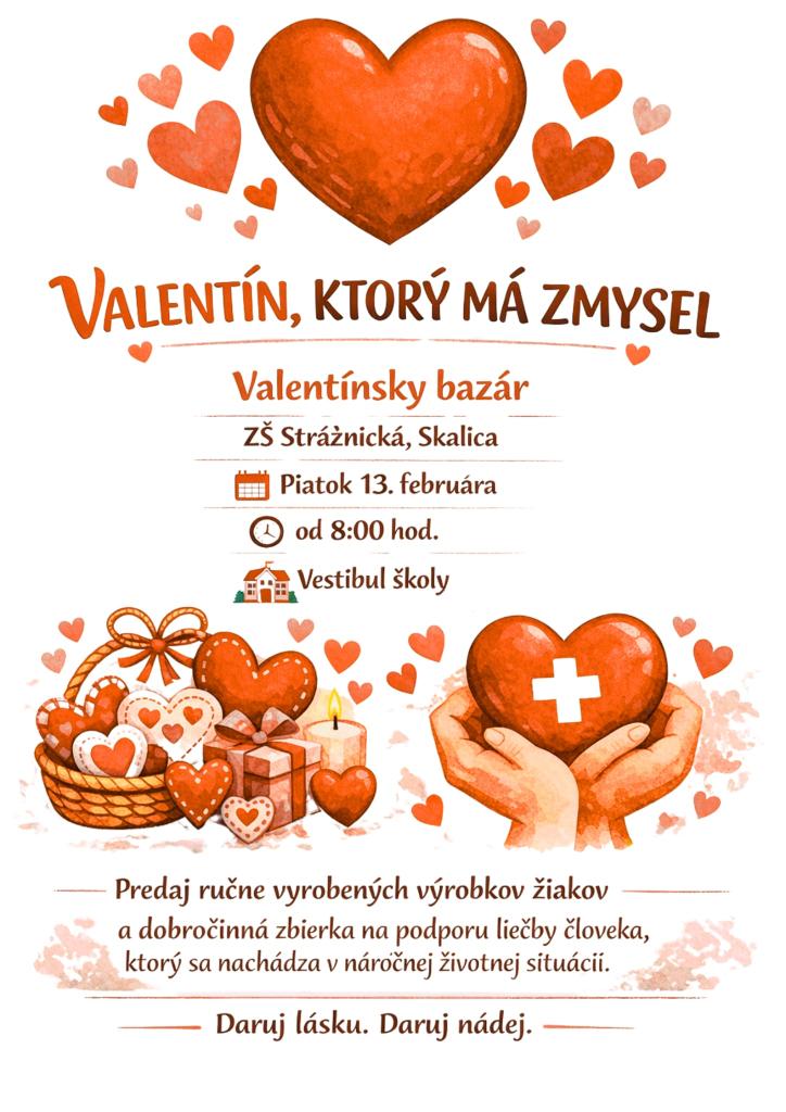 Charitatívny valentínsky bazár s ručne vyrábanými prácami žiakov školy a zároveň dobročinná zbierka na podporu liečby človeka v ťažkej životnej situácii. Akcia sa uskutoční vo vestibule školy.